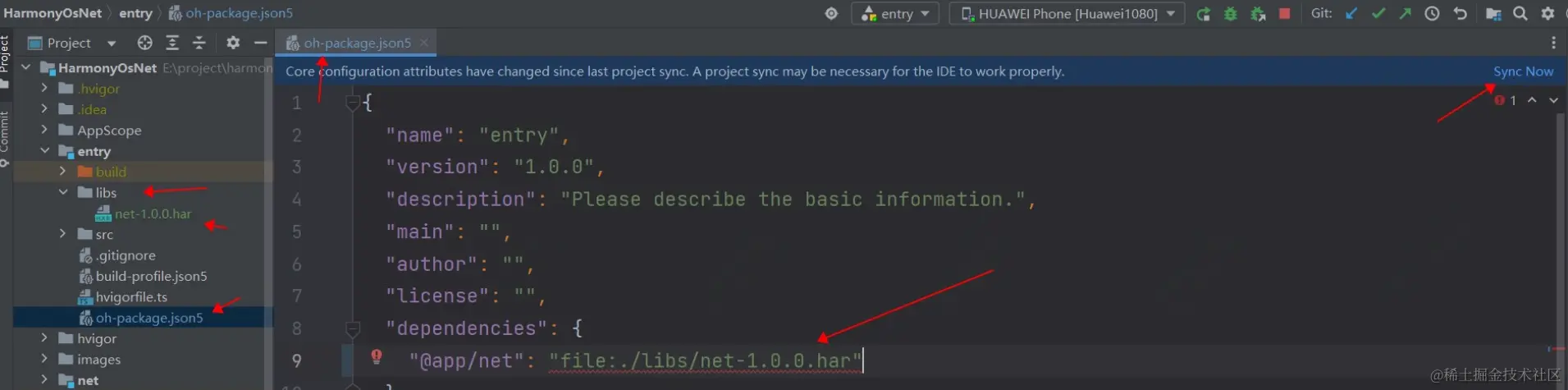 引入之后,进行同步项目,点击Sync Now即可,当然了你也可以,将鼠标放置在报错处会出现提示,在提示框中点击Run 'ohpm install'。
