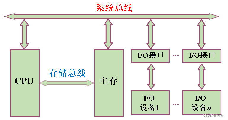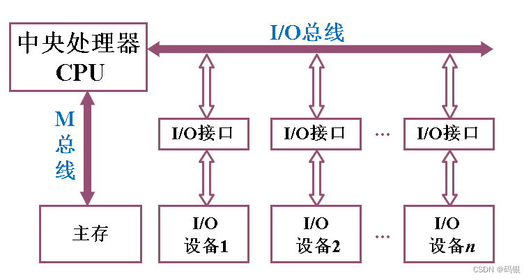 两组总线:一组总线连接CPU和主存,为存储总线(M总线);另一组是用来建立CPU和各个I/O设备之间交换信息的通道,称为输入输出总线(I/O总线)。