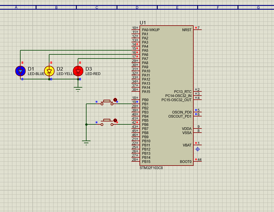 在仿真电路中,三个 LED 分别连接到 PA0(蓝色 LED)、PA1(黄色 LED)和 PA2(红色 LED)。实际电路设计中需注意: