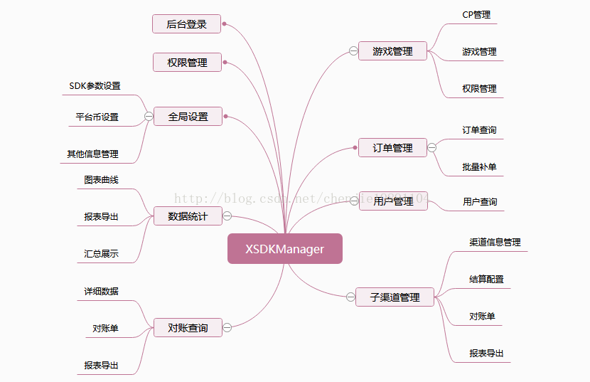 如上图所示,根据SDK业务需求和运营需求,我们分析出后台管理系统需要完成的功能,主要是对客户端相关的参数进行管理配置,对游戏、CP信息等进行管理以及对用户和订单可以完成多种条件的查询。后台不止一个业务人员操作,所以后台本身需要有登录和对应的权限管理。