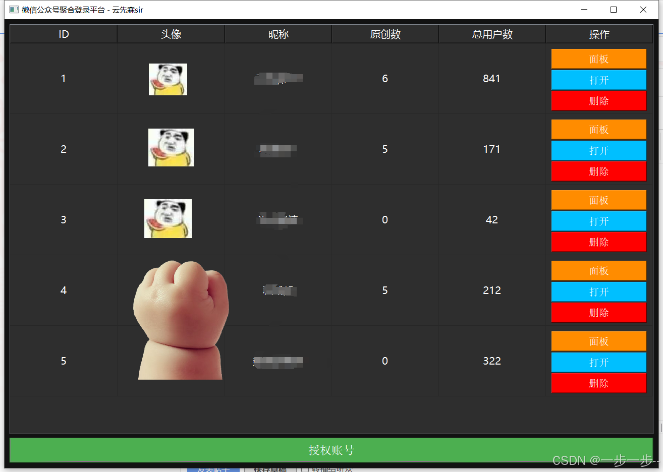 【Python】公众号聚合登录+源码 面板功能,我打算做一个单独的页面【但是不知道做啥,就先放这里,希望各位老板提供想法~】ps:我打算面板页面做一个A|功能,就是设置好关键词后,自动生成文章,自动发公众号【这种违法不?废话不多说了,直接上图,回复拿软件和源码【自己打包,配置环境比较复杂】写这个软件就是因为其他平台的会员太贵了【某小二】,还不如自己写个,不恨制账号登录数授权,打开和删除功能都是正常的,