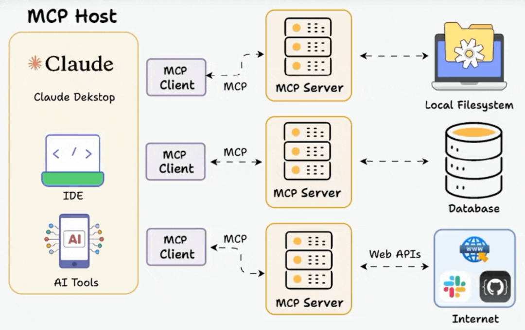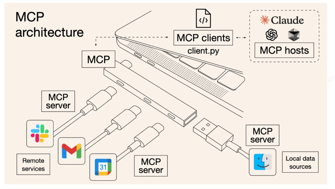 USB-C 提供了一种标准化的方式将设备连接到各种外围设备和配件,MCP 也提供了一种标准化的方式将 AI 模型连接到不同的数据源和工具。