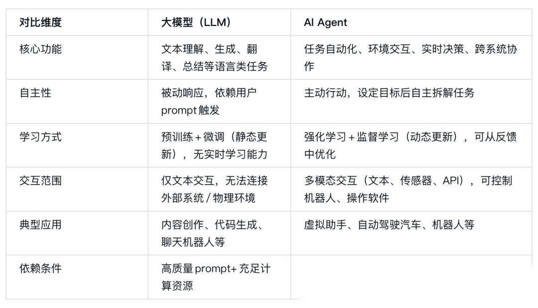 由此可见,大模型的优势集中在信息处理效率,例如1小时内生成10篇产品描述;而AI Agent的优势在于任务落地能力,例如1小时内完成100个订单的异常核查与处理。二者的差异并非优劣之分,而是能力分工,这为后续的协同应用奠定了基础。