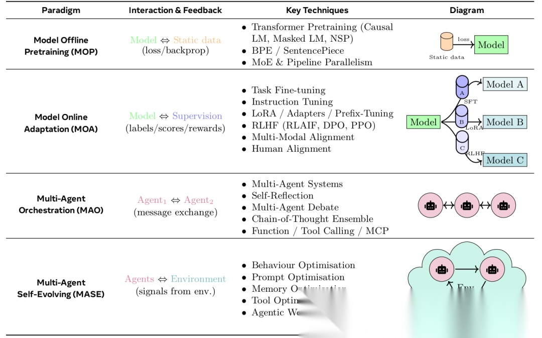 - 建立四阶段范式演进模型(MOP→MASE),揭示从静态模型到自进化系统的路径;
