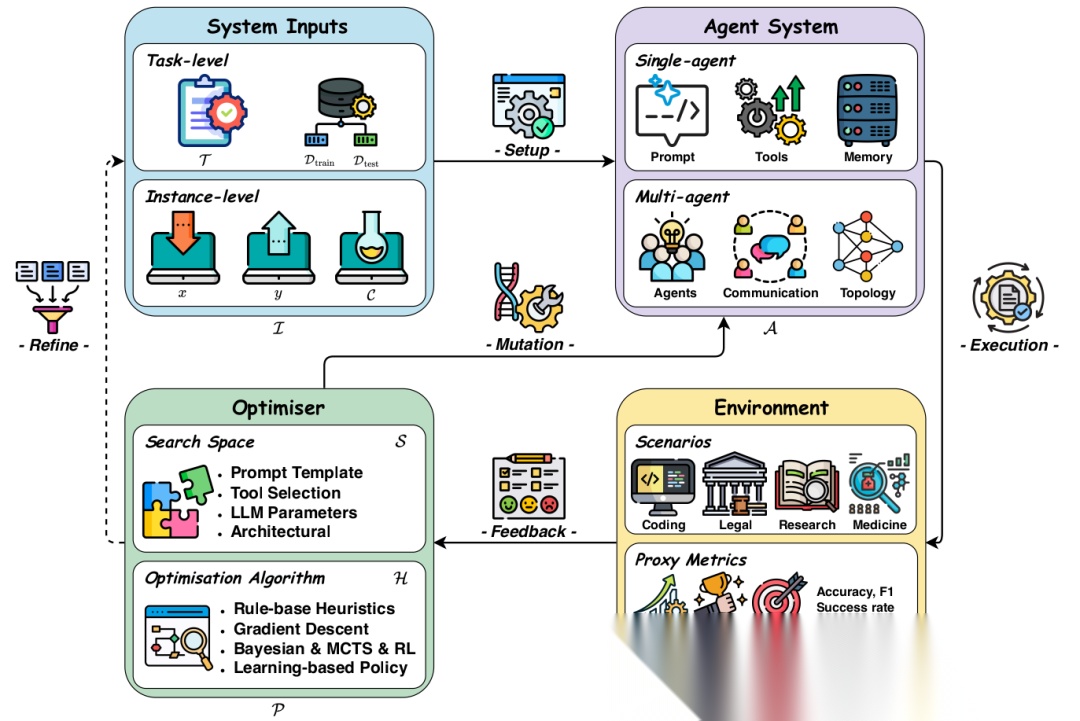 - 优化器(Optimizer):根据反馈调整智能体配置。