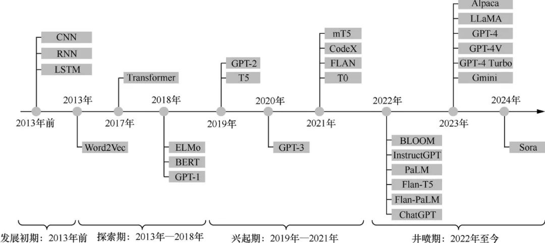 2017年Google公司提出的Transformer架构引入了自注意力机制和位置编码,改进了RNN和LSTM不可并行计算的缺陷。Google公司发布的模型还包括2018年用来解决NLP(Natural Language Processing,自然语言处理)中的多义词问题的双向LSTM语言模型ELMo以及2018年基于Transformer架构的具有3.4亿个参数的BERT模型。OpenAI公司推出的生成式预训练语言模型包括2018年的具有1.1亿个参数的GPT、2019年的具有15亿个参数的GPT-2、2020年的具有1750亿个参数的GPT-3,以及2022年的ChatGPT。这些模型或产品将大模型的发展推向高潮。2023年,越来越多的开源模型如LLaMA、ChatGLM等相继发布。