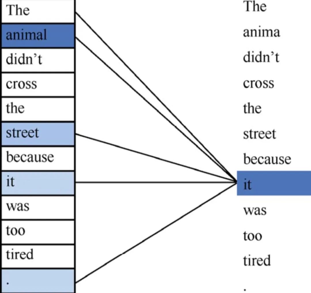 大模型的核心生成原理是将输入的语句以词向量的表征形式传递给神经网络,通过编码器/解码器(Encoder/Decoder)、位置编码和自注意力机制建立单词(或字)之间的联系。从宏观的视角来看,输入的每个单词(或字)首先会与已经编码在模型中的单词(或字)进行相关性计算,然后把这种相关性以编码的形式叠加在每个单词(或字)中。如图2所示,经过计算后,“it”与输入句子中的其他单词的相关性权重将会增加,颜色越深代表相关性越高。