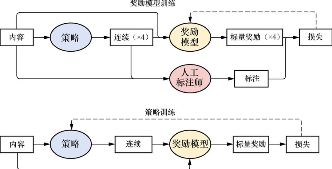 第二阶段,目标是训练奖励模型。奖励模型应能评判InstructGPT模型的输出结果是否符合人类偏好。如图5所示,奖励模型接收一系列输入并返回标量奖励,标量奖励与人类的反馈数据共同参与损失函数的计算。在模型的选择上,奖励模型可以是经过微调或根据偏好数据重新训练的语言模型。