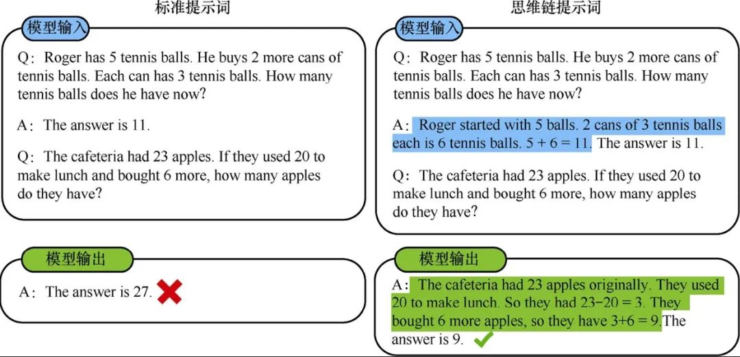 思维链(Chain of Thought)最早由Google公司的高级研究员Json Wei等人于2022年提出。思维链是一种离散式的提示学习方法,可以提高模型在复杂任务上的性能。如图6所示,为了指导大模型进行数学运算,研究人员给出少量人工编写的推理示例,并将步骤解释清晰,引导大模型对相似问题进行推理。此处将包含人工编写的详细推理过程的提示词称为思维链提示。思维链可以激发大模型的多步推理能力。这个过程类似于人类通过学习他人的思维方式来进行深度思考以解决复杂任务。