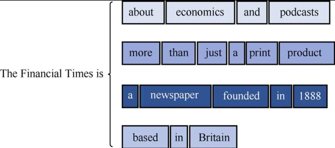 虽然模型会选择下一个最合适的单词,但是由多个最佳单词组成的句子可以并不通顺。为了解决这个问题,Transformer使用了Beam Search(束搜索)等方法以提高生成质量。这些方法不是只关注序列中的下一个单词,而是将更大的一组单词作为一个整体来考虑,同时考虑多个序列上的联合概率。如图4所示,我们同时考量4个序列上的联合概率(为了方便理解,此处以一组单词的颜色深浅来表示输出概率,单词的颜色越深,代表其被选择并输出的概率越大),将一组单词作为整体进行评估,可以有效提高模型的生成质量。