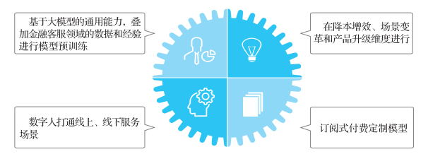 其二,在降本增效、场景变革和产品升级维度进行。AIGC 应用场景与产品类型不断丰富,率先从智能客服、智能营销场景切入,逐步拓展应用范围。比如在优化内容生产创意与效率层面,传统获客以互联网营销模式为主,结合 AIGC 技术在自动化生成营销物料的同时,实现千人千面的个性化营销。可探索在投研、研发编程、授信审核及流程管理等方面提高效率,减少基础人员投入。在通用基础能力中引入高级认知能力,整合碎片知识与多样化需求,形成创新的产品化模型与业务解决方案。
