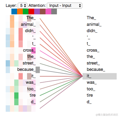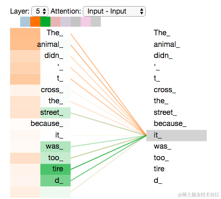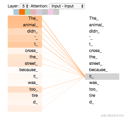 在对“it”进行编码时,其中一个注意力部分主要关注于“the animal”,而另一个则聚焦于“tired” —— 这就意味着,模型中“it”这个词的理解融合了对“animal”和“tired”这两个词的理解。