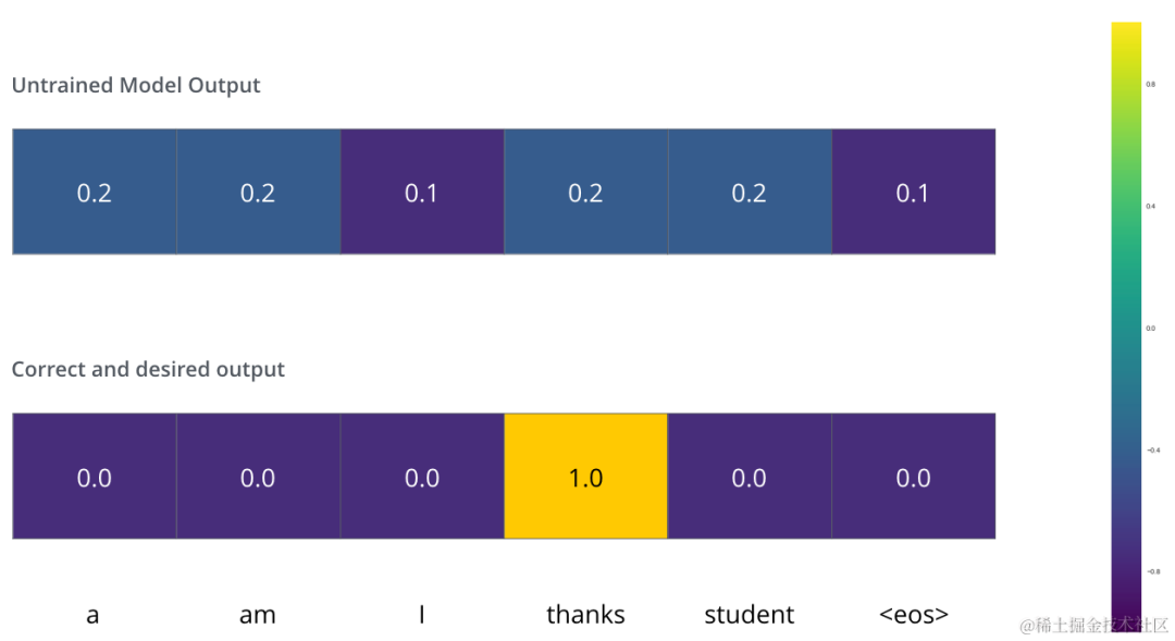 这意味着我们想得到一个输出,它以概率分布的形式表示“thanks”。但鉴于模型尚未训练完全,这种情况不会马上出现。