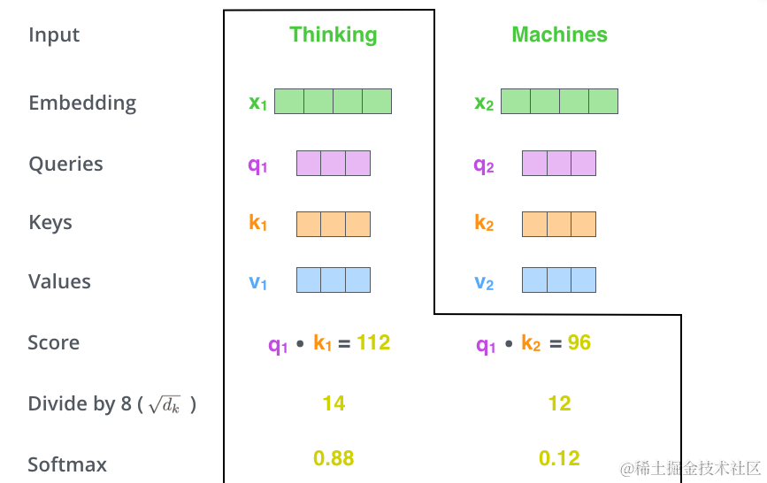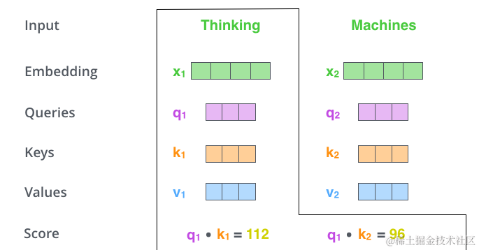 这个得分是通过计算查询向量与相应单词的键向量的点积来得出的。因此,如果我们正在处理位置#1 的单词“Thinking”的自注意力,第一个得分将是 q1 和 k1 的点积,第二个得分则是 q1 和 k2 的点积。