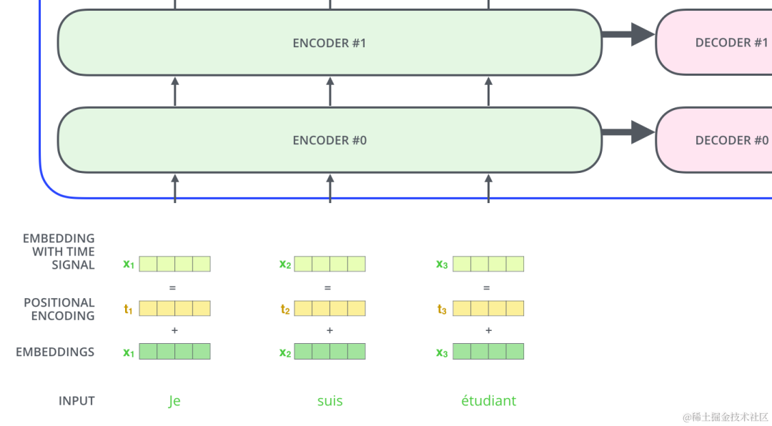 为了解决这个问题,Transformer 为每个输入嵌入加入了一个特定的向量。这些向量遵循模型学习到的一个特殊模式,这有助于模型确定每个单词的位置,或序列中不同单词间的距离。