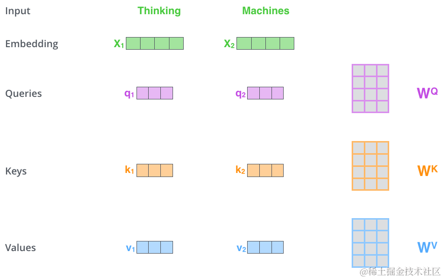 在计算自注意力的第一步,我们需要从编码器的每个输入向量(这里是每个单词的嵌入)生成三个向量:一个查询向量(Query vector)、一个键向量(Key vector)和一个值向量(Value vector)。