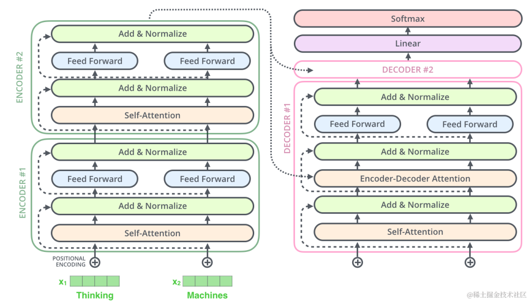 解码器的子层同样遵循这一原则。如果我们设想一个由两个堆叠的编码器和解码器组成的 Transformer,其结构大致如下所示: