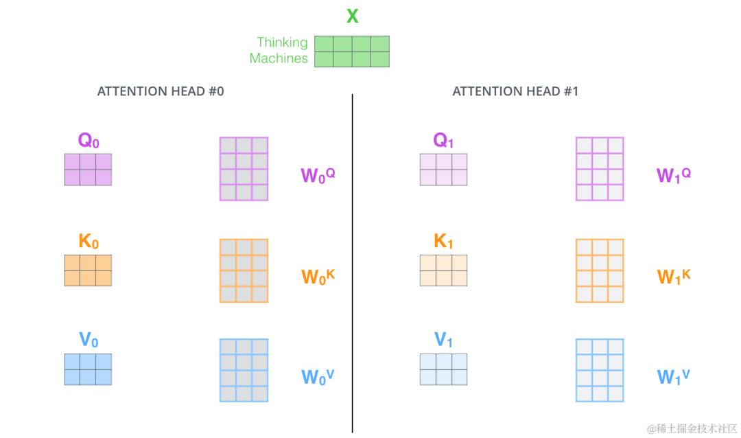 在多头注意力机制中,我们为每个头维护独立的查询(Q)/键(K)/值(V)权重矩阵,从而得到不同的 Q/K/V 矩阵。我们像之前那样,将输入 X 与 WQ/WK/WV 矩阵相乘,以产生 Q/K/V 矩阵。