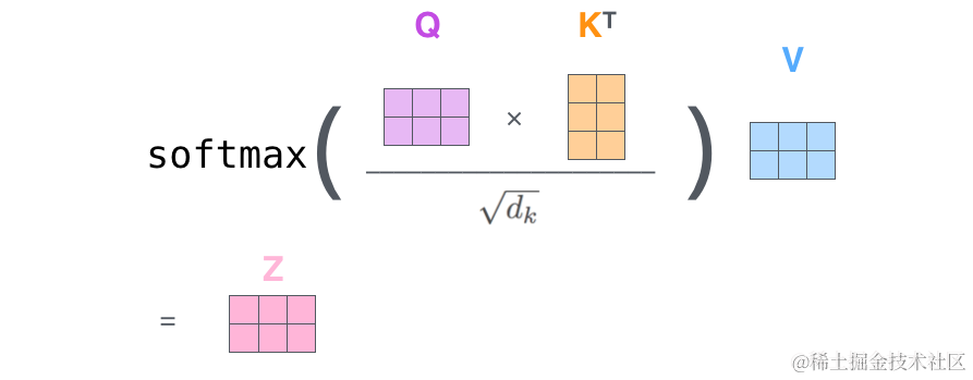 不过,在实际的实现中,为了提高处理速度,这一计算过程是以矩阵的形式进行的。现在我们已经理解了在单词层面上的计算直觉,下面就来看看矩阵形式的计算。