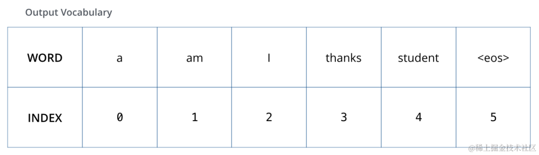 为了更直观地理解,假设我们的输出词汇表仅包含六个单词:“a”, “am”, “i”, “thanks”, “student”和“”(代表“句子结束”)。