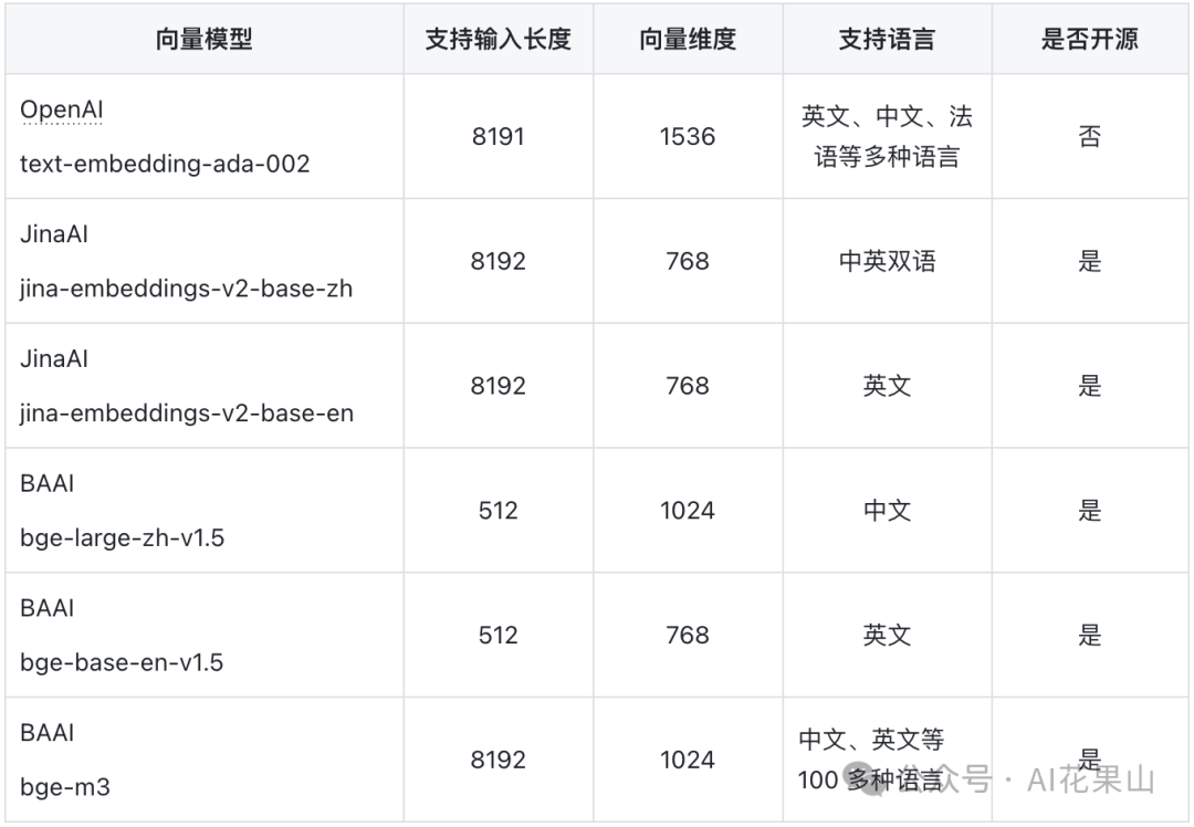 在下面的表格中,笔者对比了几个向量模型在支持序列长度、向量维度和支持语言等方面的差异。
