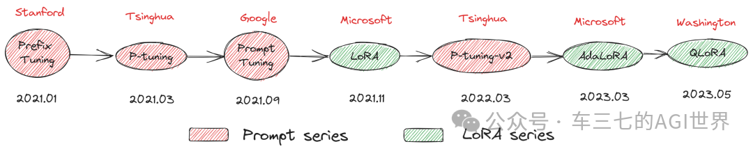 参数高效微调的方式有很多种,比如网上传播常用的有七种。其发布时间线如下: