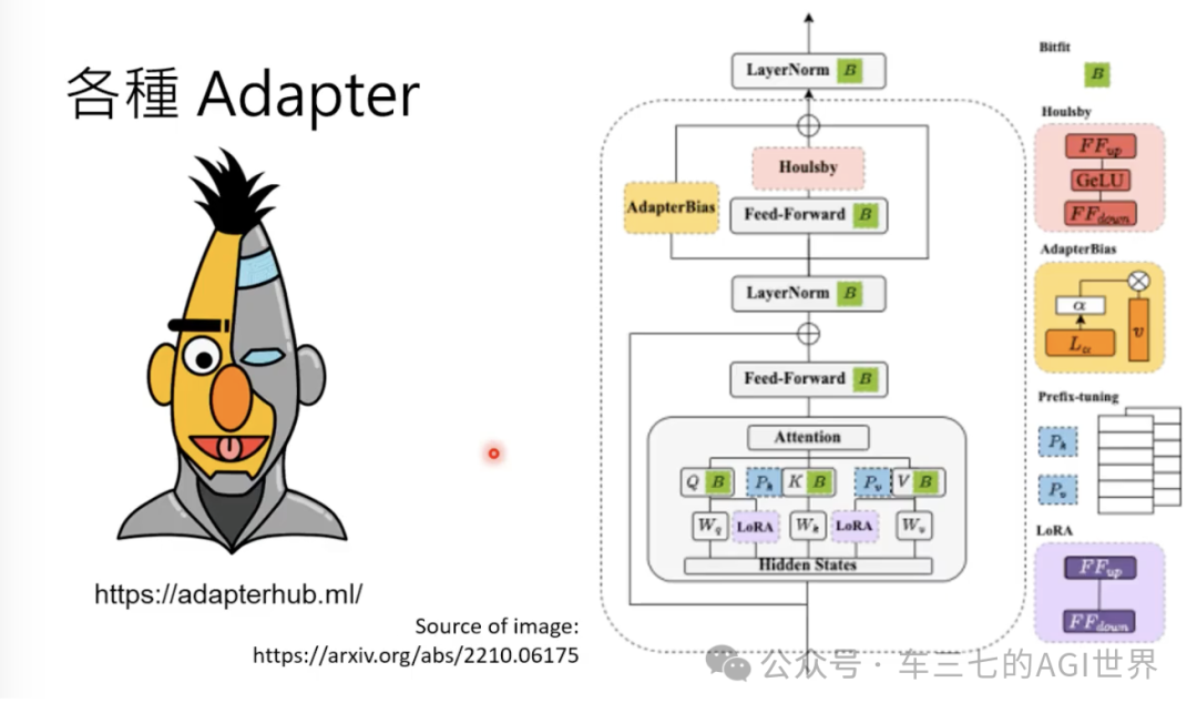 Houlsby N等人提出的Adapter方法,常规意义上理解的,在预训练模型每一层(或某些层)中添加Adapter模块,微调时冻结预训练模型主体,通过训练Adapter模块的参数来适应特定下游任务。
