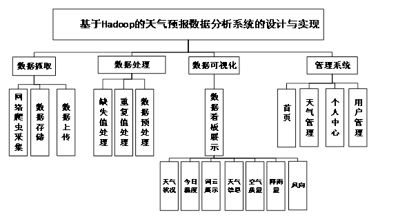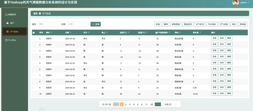 在数据处理完成后,数据可视化模块将这些信息转化为直观易懂的可视化图表,如天气状况、今日温度、词云展示、空气质量、降雨量及风向等,使用户能够轻松地理解复杂的天气数据。此外,管理系统为管理员提供了便捷的管理工具,包括首页概览、天气管理和个人中心,使得系统的日常运维和用户管理变得更加高效和简便。系统不仅充分利用了Hadoop的大数据处理优势,还通过模块化的设计思路,实现了天气数据的全生命周期管理,从数据的采集、处理到最终的展示和应用,形成了一个高效、可靠且易于扩展的分析平台。这种设计理念不仅提高了系统的性能和稳定性,也为未来的功能拓展奠定了坚实的基础。以下功能模块: