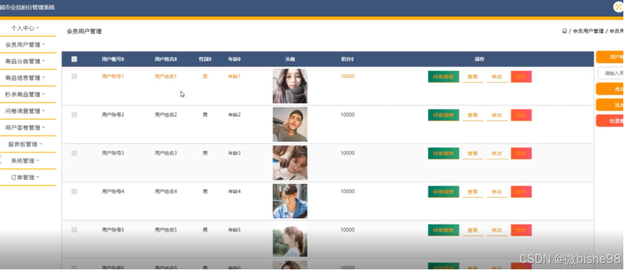 管理员在会员用户管理页面中可以查看用户账号、用户姓名、性别、年龄、头像、积等信息,并可根据需要对会员用户进行问卷调查、查看、修改、删除等操作,如图6-12所示。