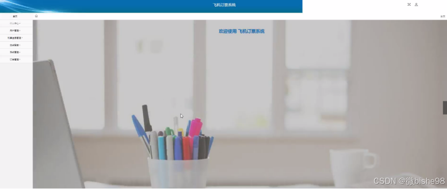 管理员进入系统主页面,主要功能包括对首页、个人中心、用户管理、机票信息管理、在线留言、系统管理、订单管理等进行操作。管理员主页面如图5-7所示: