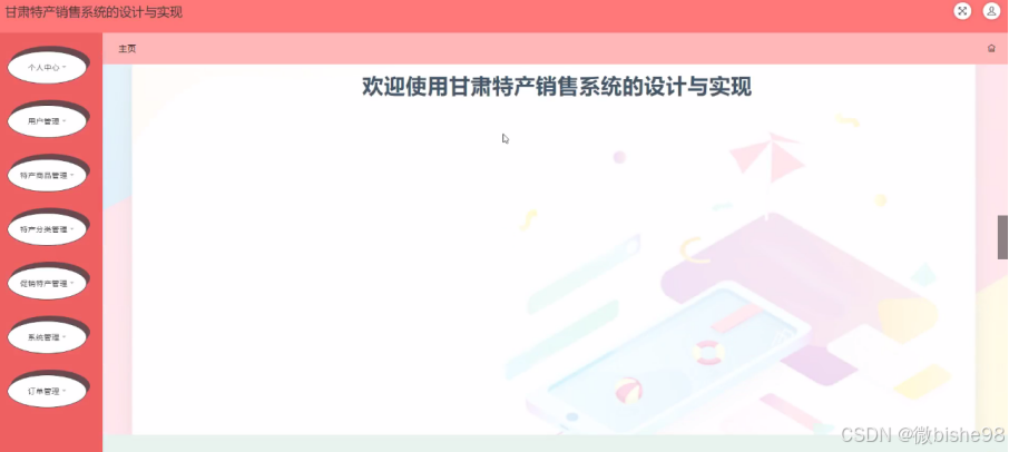 管理员登录进入系统后台可以查看个人中心、用户管理、特产商品管理、特产分类管理、促销特产管理、系统管理、订单管理等内容,如图5-3所示。