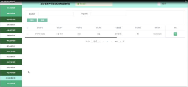 - 毕业申请管理:管理员可以查看并处理学生的毕业申请,包括查询、重置、删除申请信息,查看申请详情,进行审核操作。