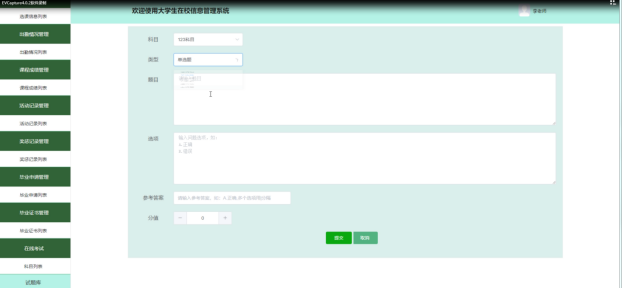 - 在线考试:教师用户拥有在线考试系统的全面管理权限。他们可以查看科目列表、试题库、试卷列表,了解每个科目下的考试安排。管理试题库,添加、查询、重置、删除试题,确保试题库的时效性和准确性;通过这些功能,教师用户能够高效地组织和管理在线考试,提升教学效果和评估质量。
