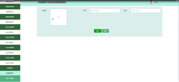 - 个人中心:学生用户可以在此页面查看查看个人首页、学生信息、选课信息、出勤情况、课程成绩、活动记录、奖惩记录、毕业申请、毕业证书、收藏、评论管理等操作,设置个人偏好。