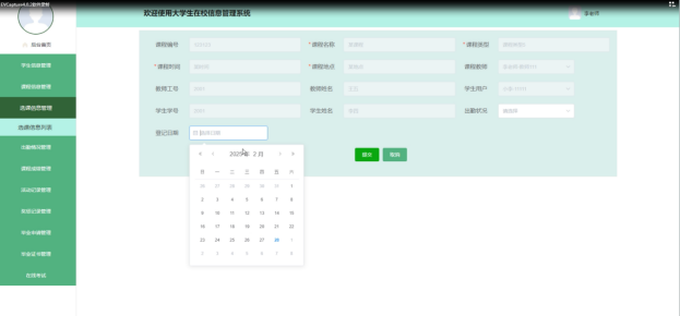 - 选课信息管理:管理员可以全面管理选课信息,包括查询、重置、删除选课信息,添加新的选课信息,进行出勤登记,管理课程成绩,审核选课申请等。