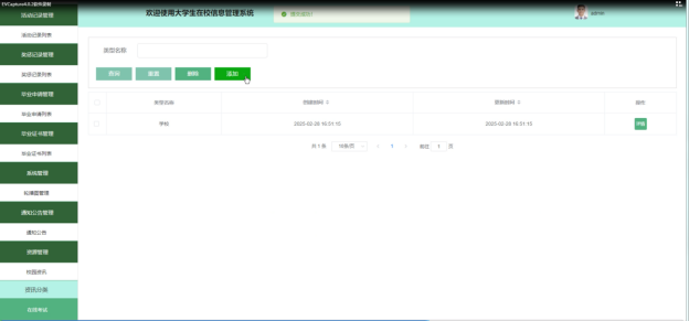 - 资源管理:管理员可以管理校园资讯和资讯分类,包括查询、重置、删除、详情查看和添加操作,同时,也能对资源进行全面管理。