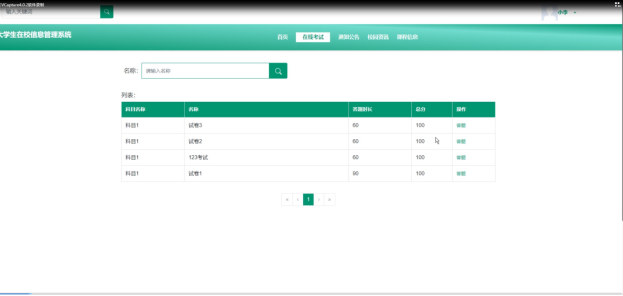 - 在线考试管理:管理员可以查看科目列表,管理试题库和试卷列表,包括查询、重置、删除、详情查看和添加操作,全面管理在线考试系统。