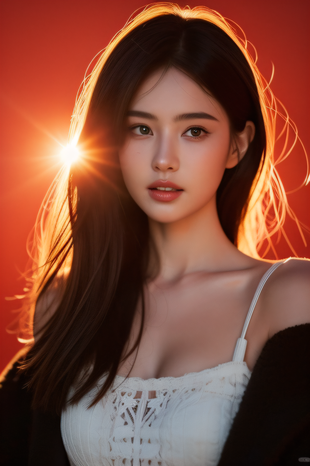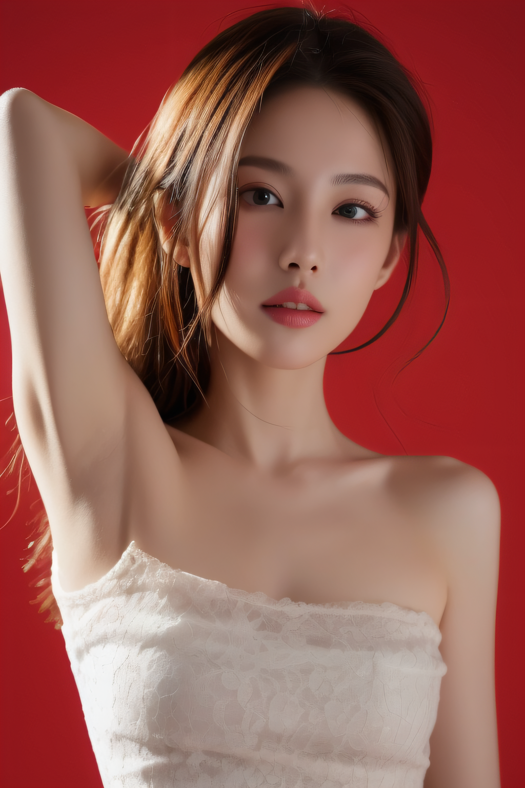 提示词:1超级漂亮的时尚模特,高领蕾丝上衣,看着观众,上身,简单背景,红色背景,前灯,侧灯