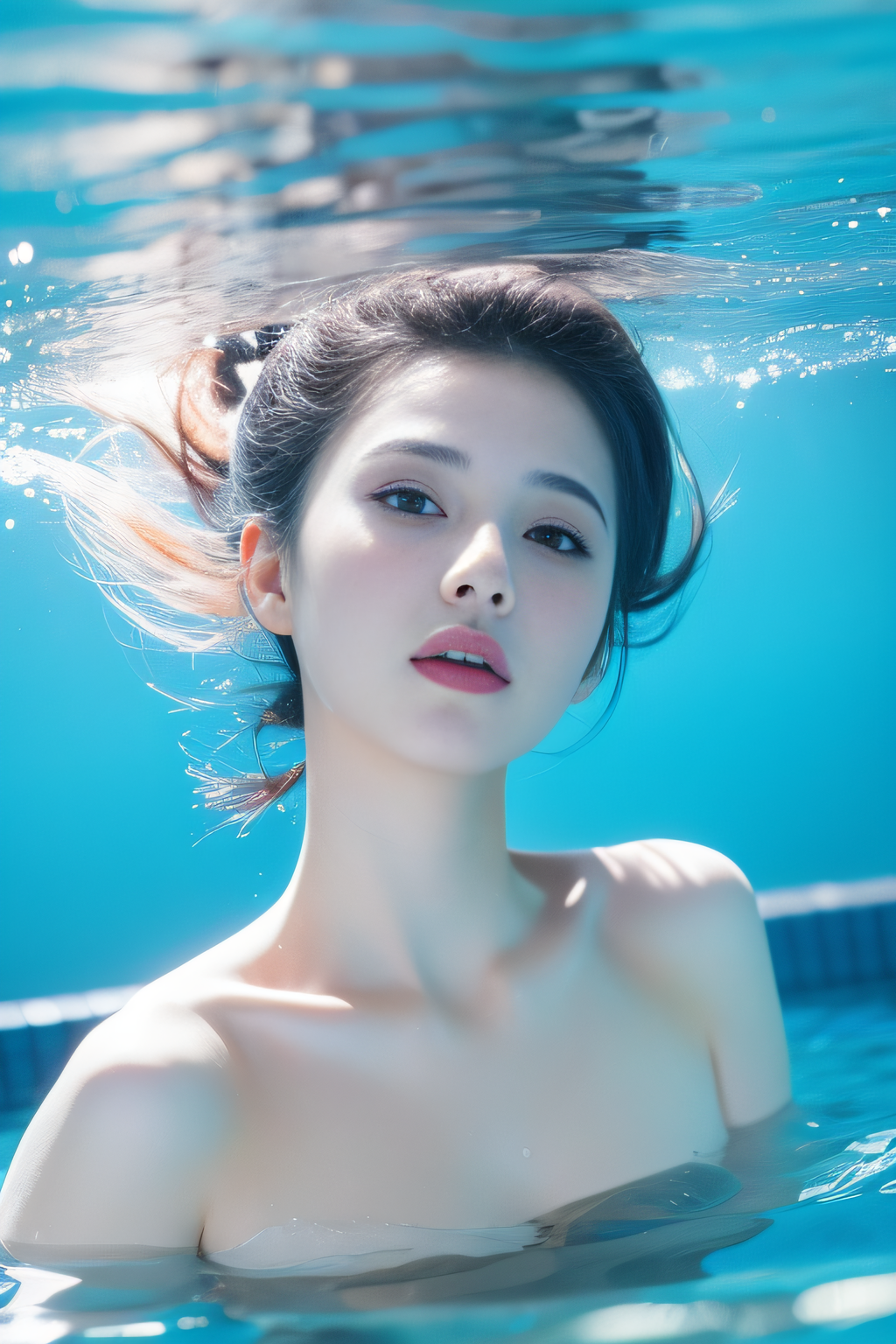 **提示词:**女孩,美女,在水下,在泳池里,蓝色的主题