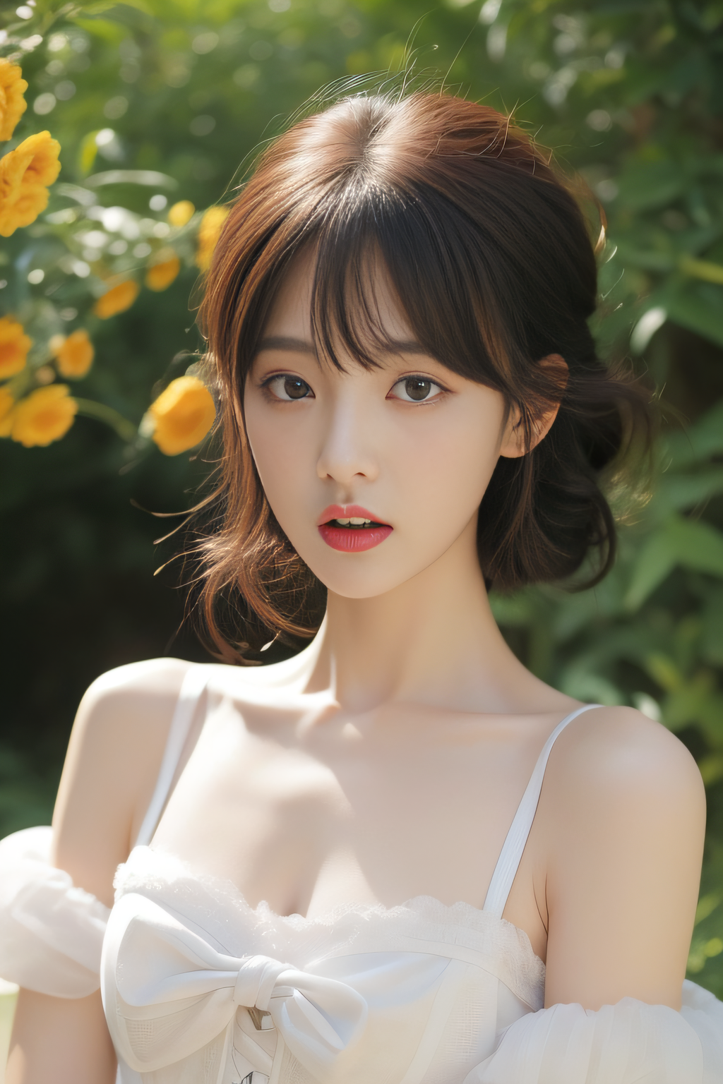 **提示词:**1个女孩,独奏,刘海,歪头,张嘴,紧身胸衣,性感,上半身,户外,花园,五颜六色的花朵,电影的角度