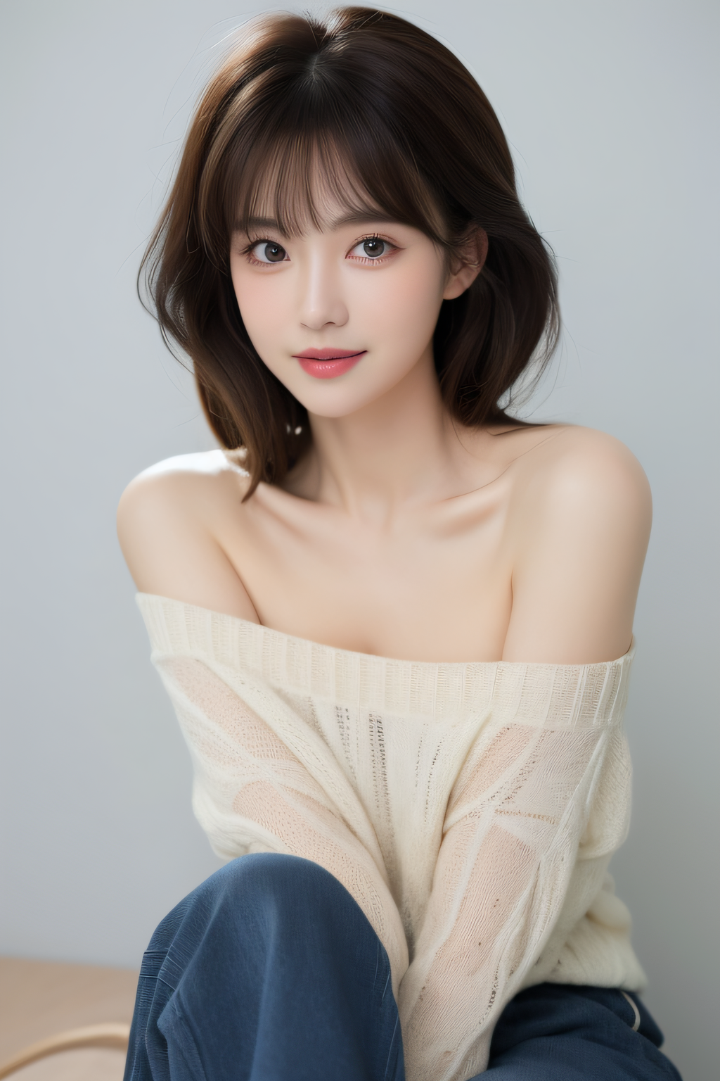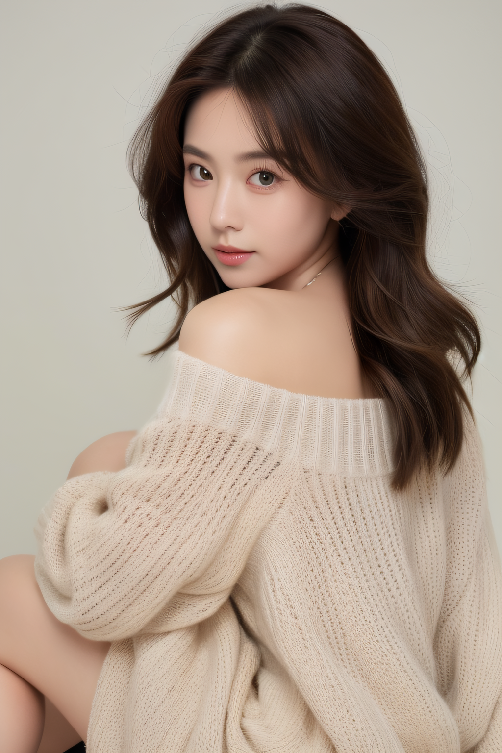 提示词:1个女孩,露肩毛衣,魅力四射,看着观众,简单的背景,前光,侧光