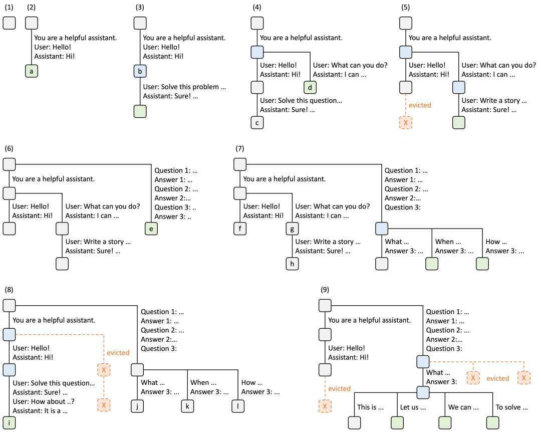 RadixAttention 操作示例,采用 LRU 驱逐策略,展示了九个步骤
