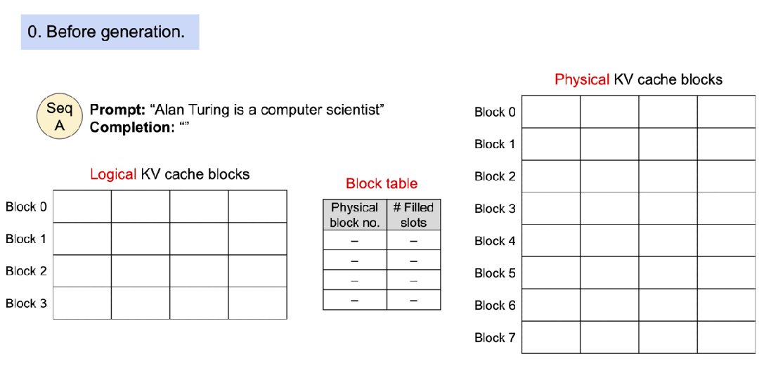 PagedAttention:KV 缓存被划分为块;块在内存空间中不需要连续。