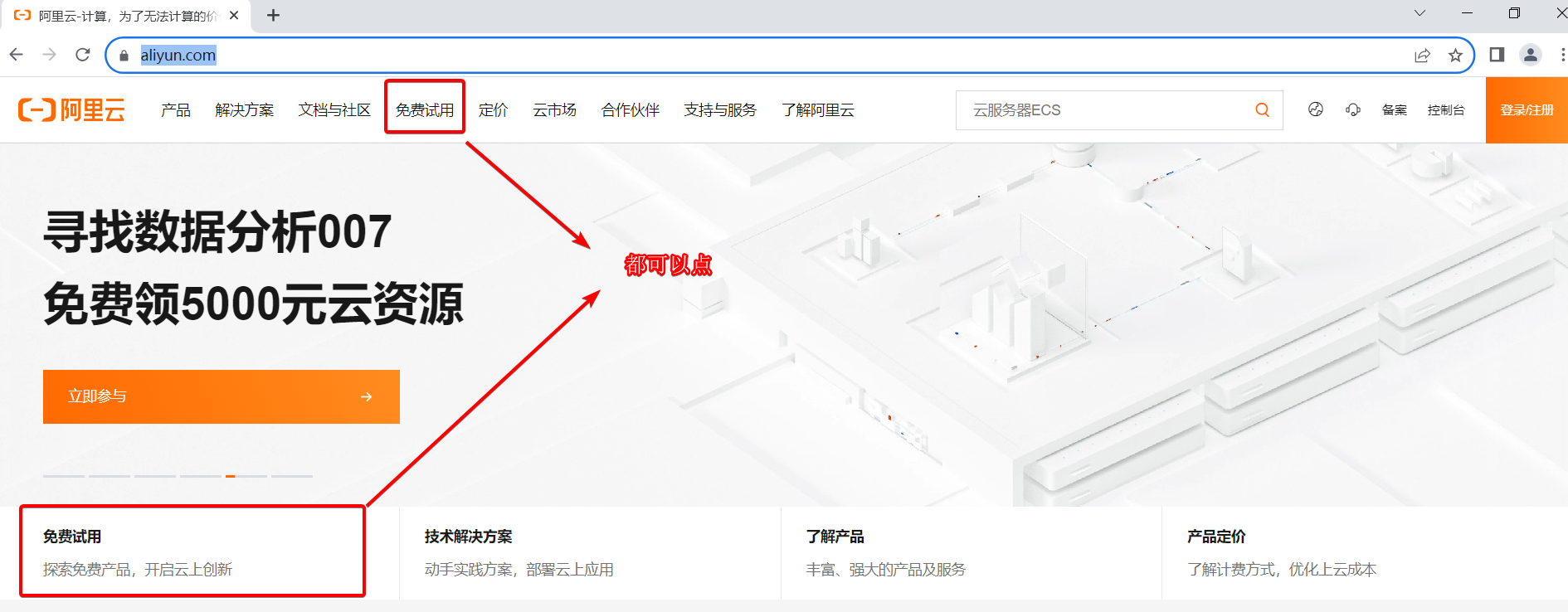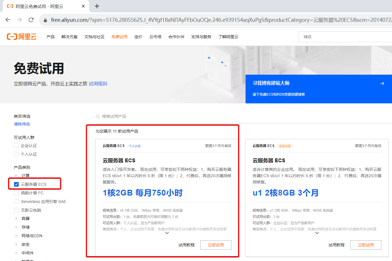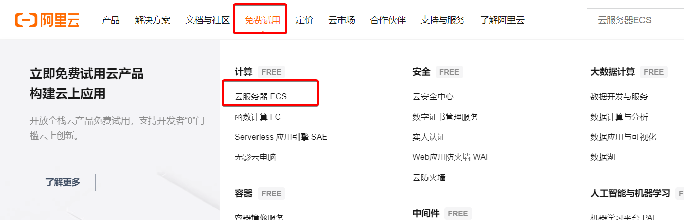- 访问试用入口:登录阿里云免费试用中心,选择 “云服务器 ECS”阿里云。