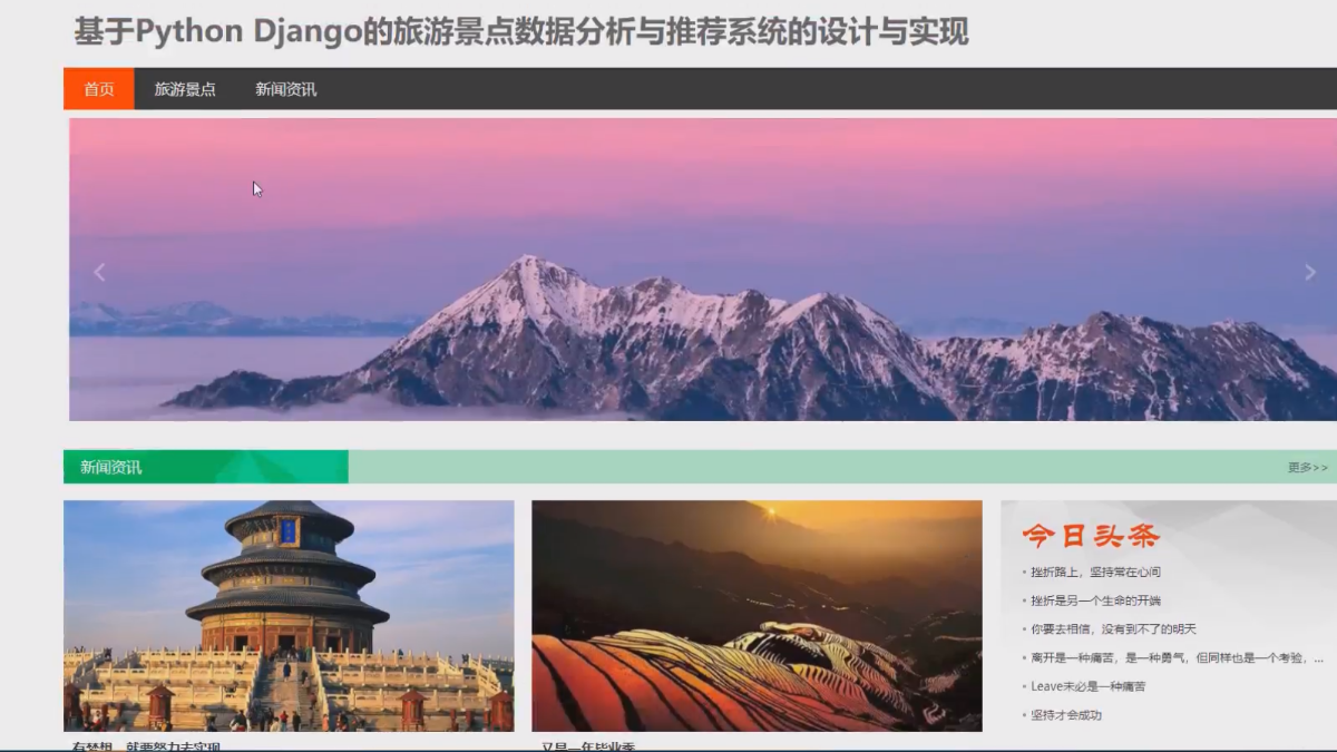python内蒙古旅游景点数据分析系统 python内蒙古旅游景点数据分析系统。系统包含源码➕数据库➕仑文(送ppt)。开发技术:Python django Hadoop scrapy mysql Vue。项目内容:本系统主要包括系统首页、用户、旅游景点、周边住宿、周边美食、美食分类、系统管理、个人资料等功能的操作平台。