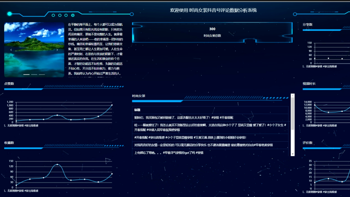 python时尚女装抖音号评论数据分析系统 本系统分为两大模块——用户模块和管理员模块。开发技术:Python django Hadoop scrapy vue mysql。管理员主要功能包括:用户管理、时尚女装管理、系统管理、我的信息等功能。python时尚女装抖音号评论数据分析系统。系统包含源码➕数据库➕仑文。