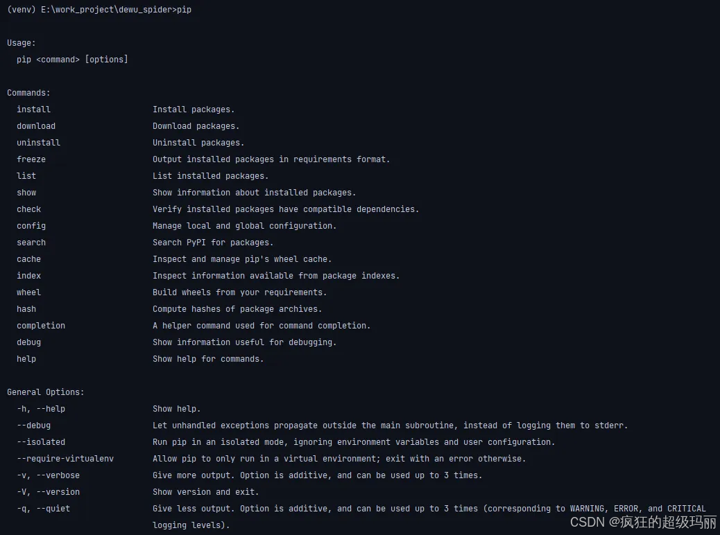 安装后,在命令行中输入pip,然后按下回车,就会出现下图所示的使用说明: