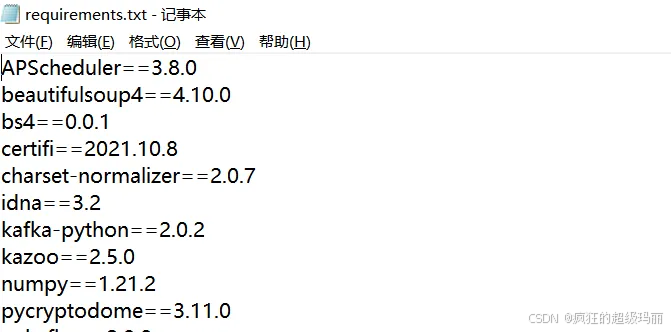 我们一般在看到别人的项目时,都会包含一个requirements.txt文件,里面包含了一些Python项目当中需要用到的第三方库