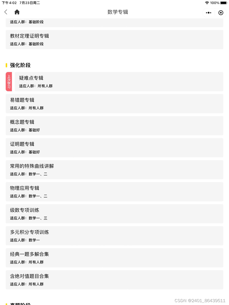 是你还在盲目刷题嘛 八月份了,大家都开始了紧张的强化阶段,但是经过了基础阶段其实我们对一些内容已经掌握的很好了,可以有针对性的去刷题,对自己的薄弱点进行重点击破了(这也是我之前遇到的问题,盲目的按照练习册库库做,做到会熟悉的题目很开心,但是对于薄弱点并没有得到很好的强化,但是总结来看又没有错很多,导致盲目乐观)第一:指定考点题型,只刷你想要的!第二:按照你喜欢的方式,刷遍真题!第三:教研团队精选题目,为你的八月保驾护航!所以我想推荐一下欧几里得的刷题新功能,助你考研数学轻松上岸120!✔️欧几里得打卡任务。
