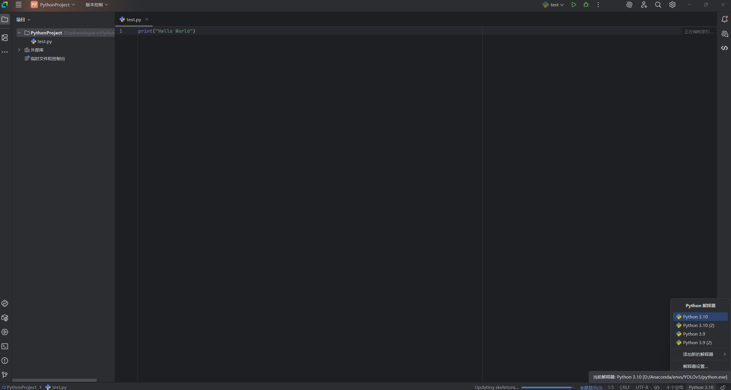 (10)选择新建项目或者打开已有的项目后进入主界面可以在右下角选择我们刚刚添加的解释器(一定要注意检查路径是否正确!!!)